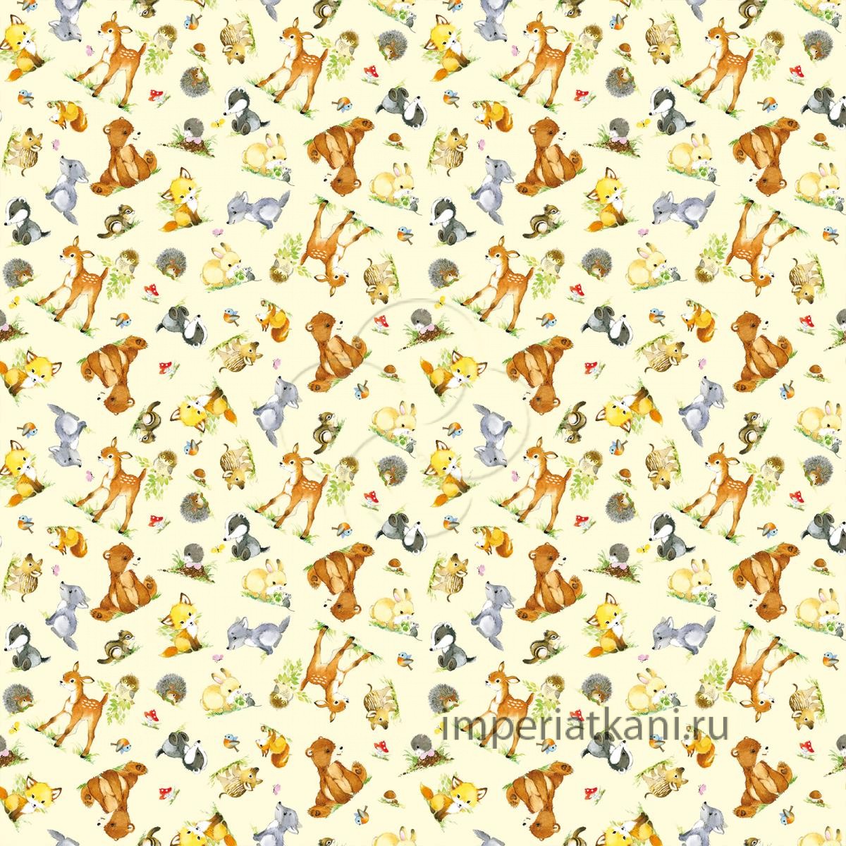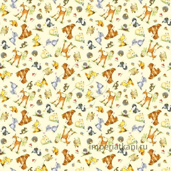 Бязь детская «13018» шириной 150 см с изображением на ткани — бельчонок, ежики, олененок, рыжая лиса; цветовая гамма: бежевая, желтая, серая. Опт от 30 000 руб., продажа рулонами.